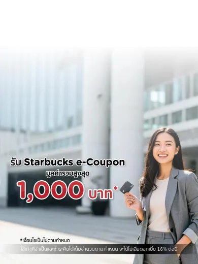 • รับ Starbucks e-Coupon มูลค่ารวม 1,000 บาท เมื่อใช้จ่ายผ่านบัตรฯ ตั้งแต่ 3 รายการขึ้นไป ภายใน 30 วัน นับจากจากวันที่ได้รับอนุมัติบัตรฯ