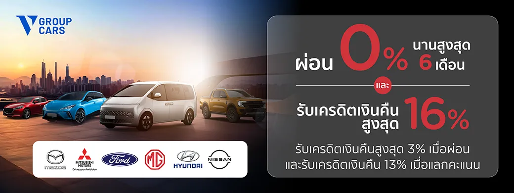 ออกรถใหม่ที่โชว์รูมภายใต้ V Group Cars แบรนด์ Mazda, Mitsubishi, Ford, MG, Hyundai, Nissan รับสิทธิพิเศษ ผ่อนชำระ 0% นาน 6 เดือน + รับเครดิตเงินคืนสูงสุด 16%