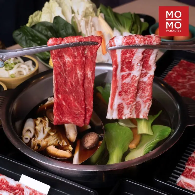 ชาบู-ชาบูและสุกี้ยากี้ร้านดัง ต้นตำรับญี่ปุ่นแท้ๆ คัดสรรวัตถุดิบพรีเมียม ไม่ว่าจะเป็นเนื้อวัวออสเตรเลียชิ้นโตหนาแต่นุ่ม เนื้อวัว US เนื้อติดมันนุ่มอร่อย หมูคุโรบูตะ ไก่ไม้ไผ่ที่ทำมาจากไก่เบญจา ปลอดสาร ปลอดภัย เป็ดอนามัย ไข่ไก่สดอนามัย ผักปลอดสารพิษหลากชนิด ตบท้ายด้วยของหวานไดฟุกุหลายรส และไอศกรีมโฮมเมด โดย Mo-Mo-Paradise จับคู่น้ำซุปและน้ำจิ้มมาให้ เพื่อให้ได้รสชาติที่ลงตัวที่สุด ไม่จำเป็นต้องมีเมนูเยอะแต่ครองใจลูกค้าได้ยาวนานด้วยรสชาติและคุณภาพ