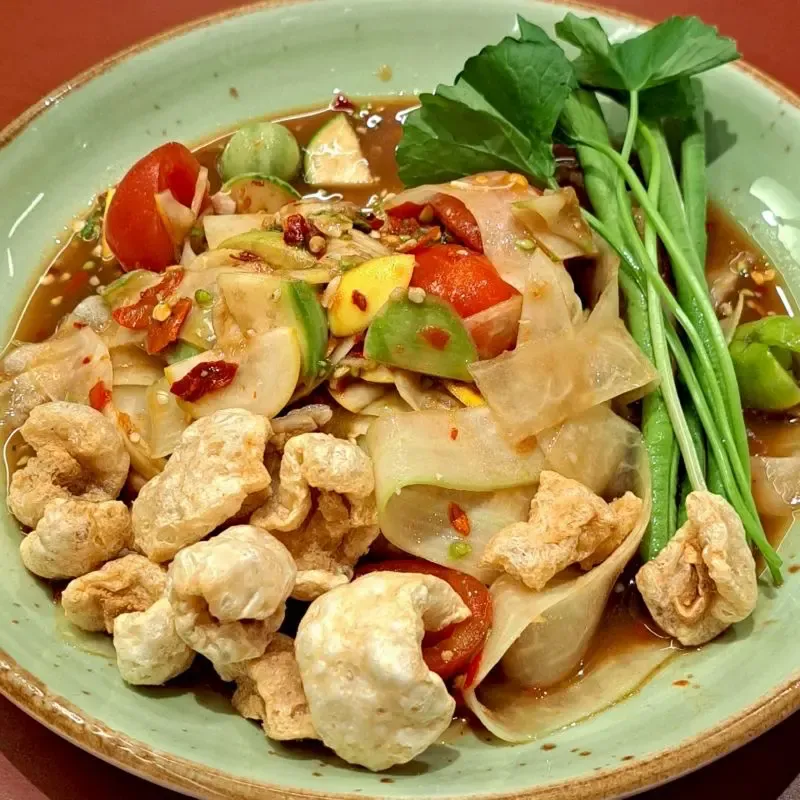 - ตำหมูกรอบ เป็นเมนูที่ตอบโจทย์คนรักเนื้อสัตว์ ด้วยหมูกรอบที่ย่างจนหอม ผสมผสานเข้ากับส้มตำที่เปรี้ยวเผ็ด ทำให้ได้รสชาติที่เข้มข้นและน่าติดใจ