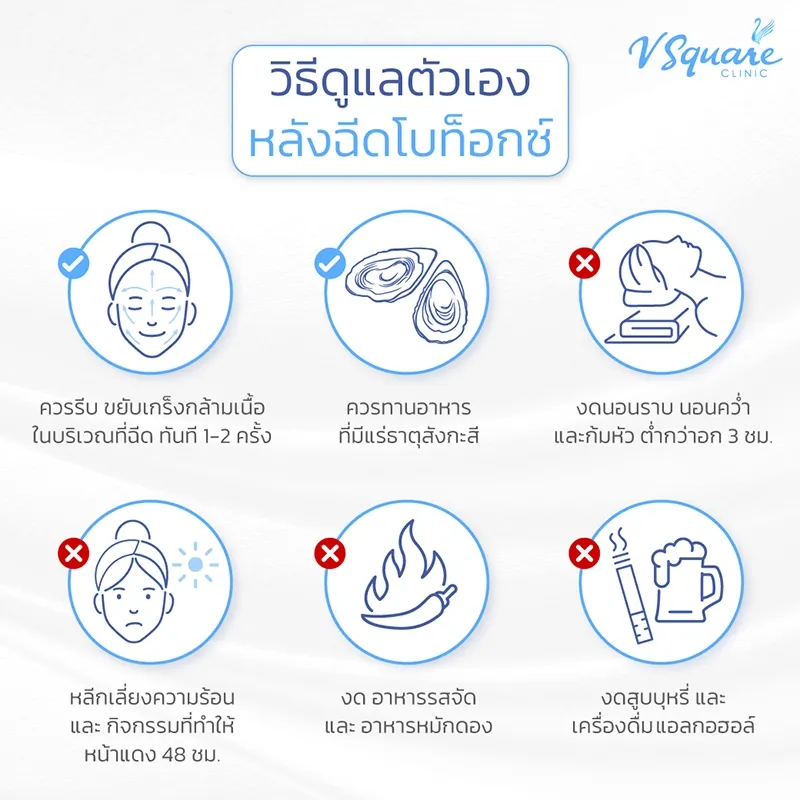 - หลีกเลี่ยงการนอนราบ นอนคว่ำ หรือก้มศีรษะต่ำในช่วงประมาณ 3 ชั่วโมงแรกหลังฉีด