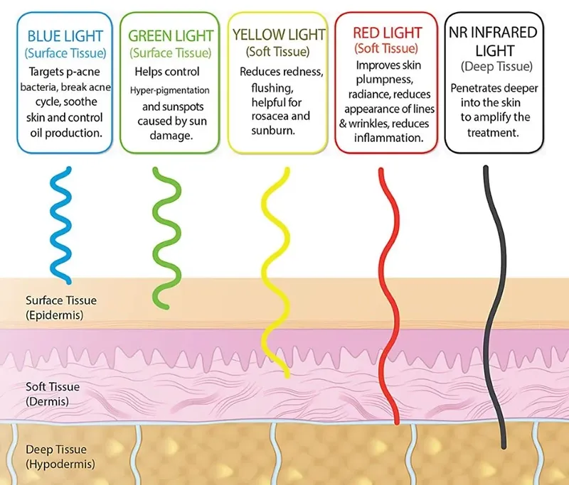แสง LED แต่ละสี แต่ละความยาวคลื่น จะกระตุ้นการทำงานของเซลล์ใต้ผิวหนัง และสามารถแก้ไขปัญหาผิวที่แตกต่างกัน เช่น ช่วยให้ร่างกายผลิตคอลลาเจนและอีลาสตินเพิ่มขึ้น ช่วยลดการอักเสบของสิว ลดฝ้า กระ จุดด่างดำ และช่วยฟื้นฟูสภาพผิว รวมถึงลดบวมหลังทำหัตถการเลเซอร์หรือผ่าตัดศัลยกรรมครับ