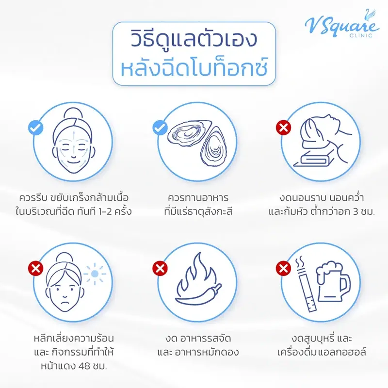 - ขยับกล้ามเนื้อบริเวณที่ฉีด 1–2 ครั้งทันทีหลังฉีด เพื่อช่วยให้โบท็อกออกฤทธิ์ดีขึ้น