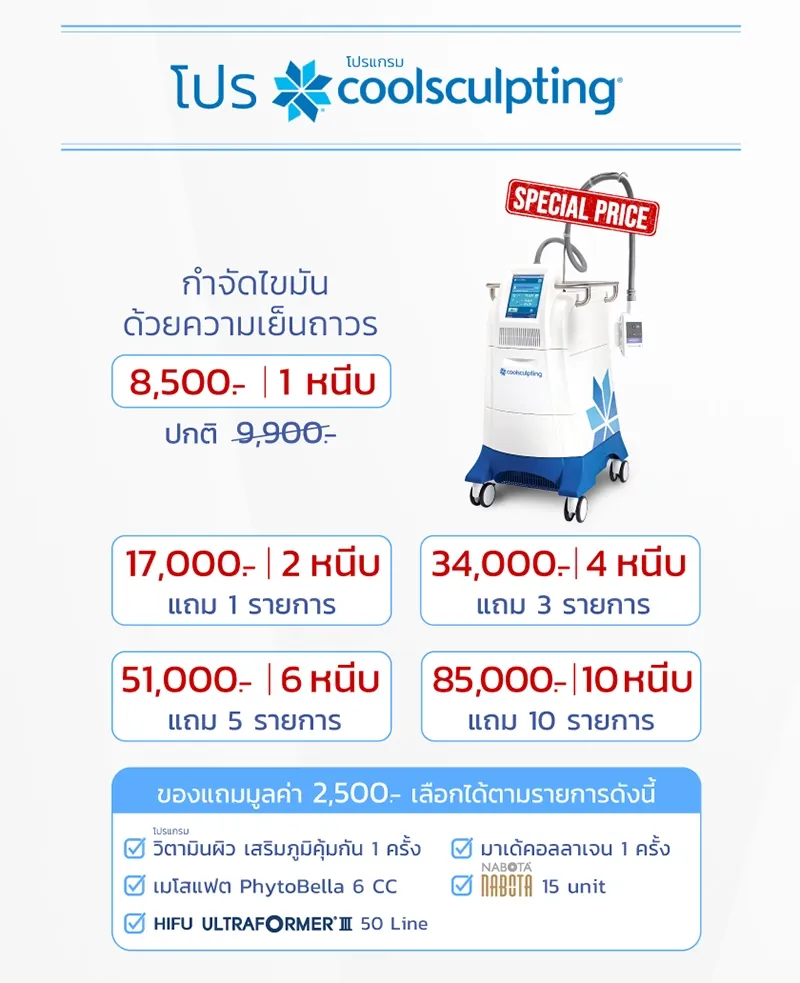 หมายเหตุ : ราคาทำ Coolsculpting อาจมีการเปลี่ยนแปลงตามโปรโมชันส่งเสริมการตลาด แนะนำให้ปรึกษาแพทย์ และอัปเดตราคาล่าสุดกับทางคลินิก