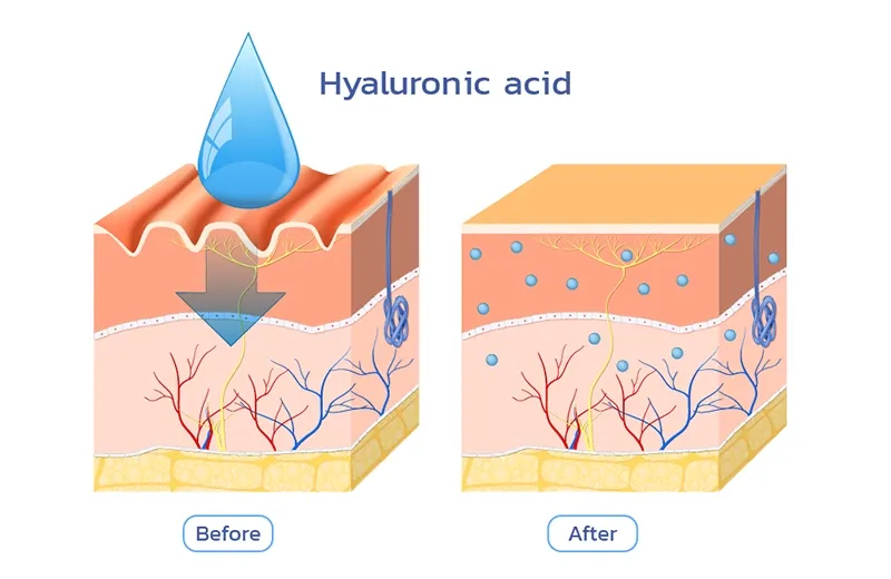 ไฮยาลูรอนเป็นสารที่ช่วยกักเก็บความชุ่มชื้นในผิวหนัง และพบได้ในร่างกายตามธรรมชาติครับ แต่เมื่ออายุเพิ่มขึ้น ปริมาณไฮยาลูรอนจะค่อย ๆ ลดลง ทำให้ผิวขาดน้ำ เกิดริ้วรอย และความยืดหยุ่นลดลงอย่างเห็นได้ชัด