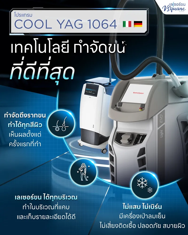 อย่างที่ V Square Clinic มีโปรแกรม 𝗖𝗼𝗼𝗹 𝗬𝗮𝗴 1064 เทคโนโลยีเลเซอร์กำจัดขนรุ่นใหม่ล่าสุดจากอิตาลีและเยอรมนี โดยเป็น Long Pulse Nd:YAG Laser Light B Evo ที่ผ่านการรับรองจาก FDA สหรัฐอเมริกา ยุโรป และไทย