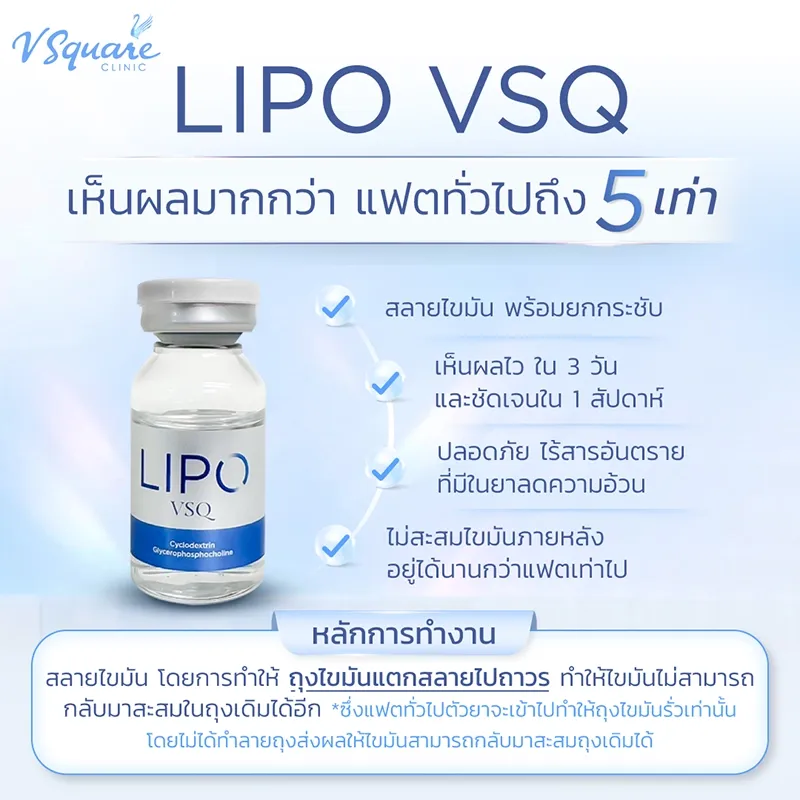 Lipo VSQ คือ ตัวยาเมโสแฟตที่มีฤทธิ์สลายไขมัน นำเข้าจากเกาหลีภายใต้แบรนด์ VSQ โดย V Square Clinic เป็นนวัตกรรมที่ช่วยลดไขมันเฉพาะจุดและกระชับผิวในขั้นตอนเดียว สามารถลดการสะสมไขมันเก่า และสลายไขมันใหม่ได้อย่างมีประสิทธิภาพ