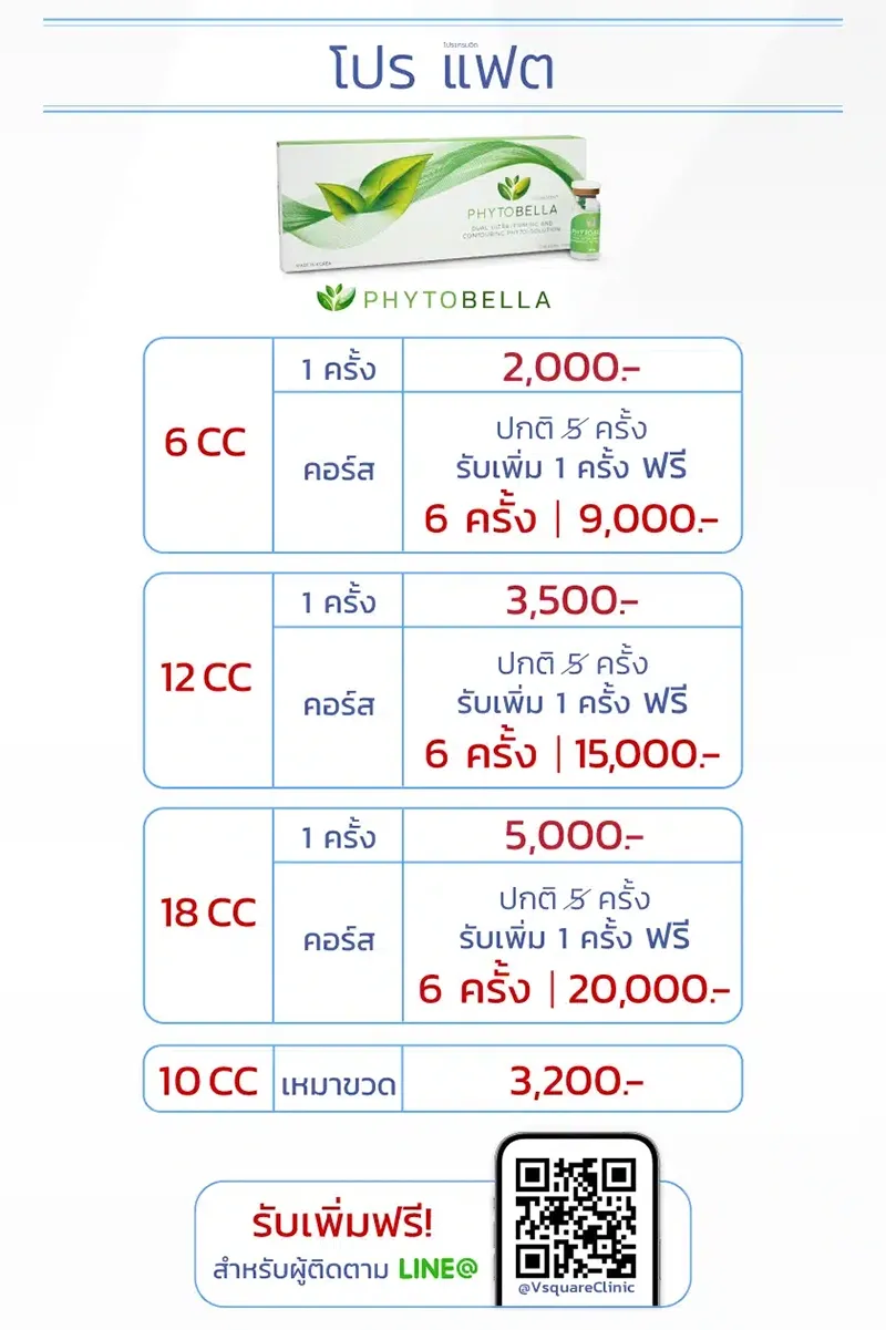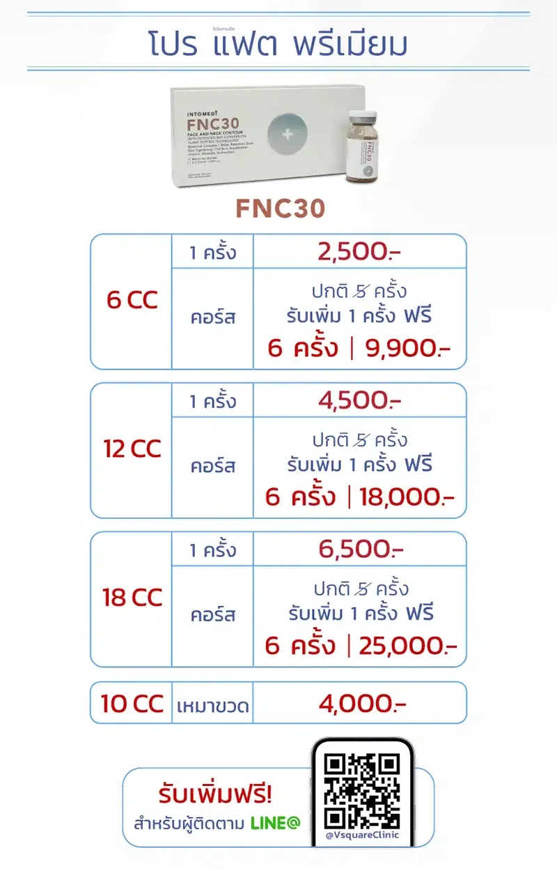 ราคาฉีดเมโสแฟตเริ่มต้นประมาณ 2,000-8,000 บาทต่อครั้ง ขึ้นอยู่กับยี่ห้อ ปริมาณ CC ที่ใช้ ตำแหน่งที่ฉีด สำหรับที่ V Square Clinic มีราคาดังนี้