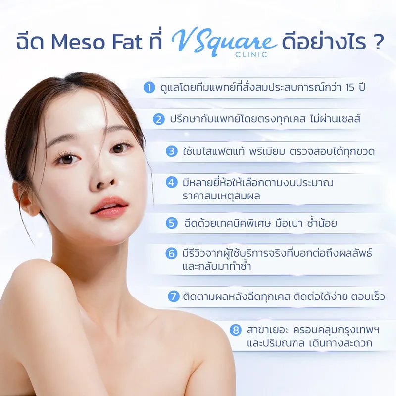 ถ้ากำลังมองหาคลินิกฉีดเมโสแฟตที่ปลอดภัย เห็นผล และคุ้มค่า V Square Clinic ถือเป็นตัวเลือกที่ตอบโจทย์ เพราะมีทีมแพทย์ที่มีประสบการณ์ด้านการปรับรูปหน้าและสัดส่วนมายาวนาน ดูแลอย่างใกล้ชิดตั้งแต่ขั้นตอนประเมินจนถึงหลังทำ