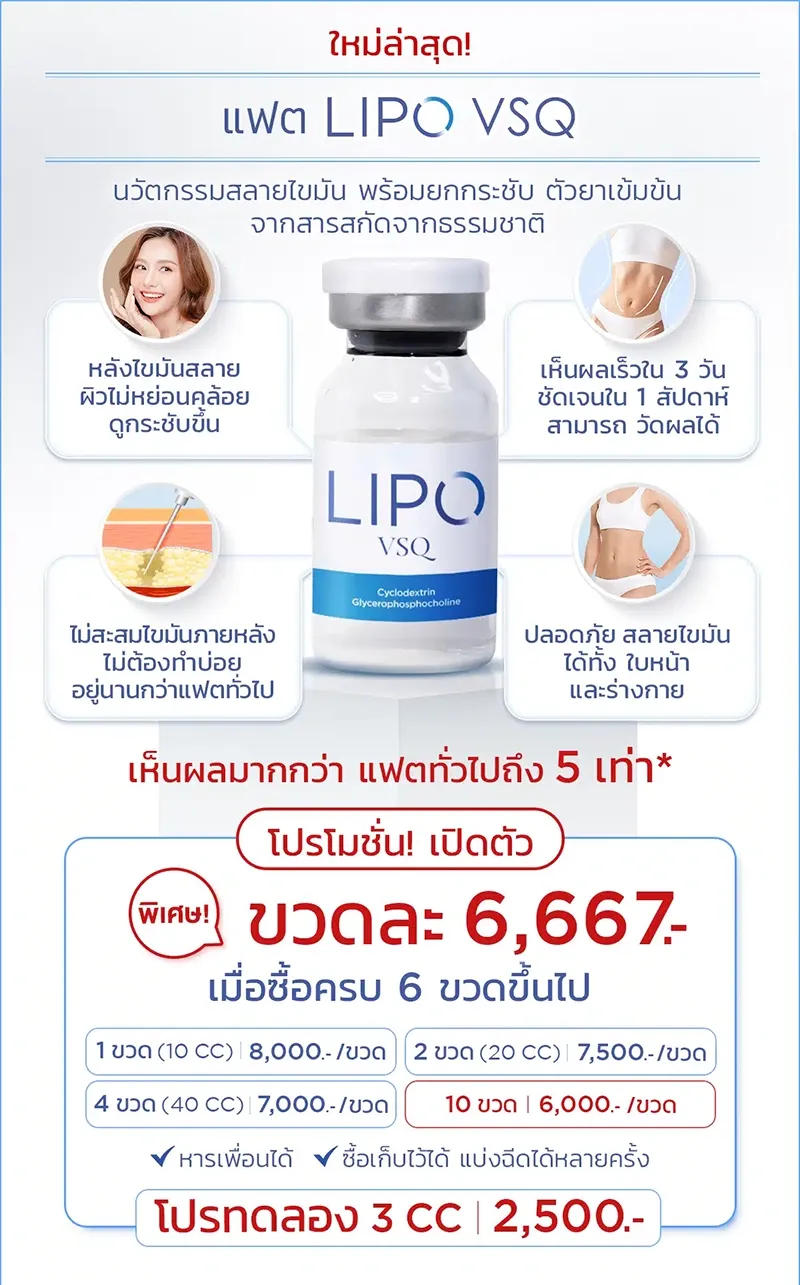 - ข้อดี : สามารถสลายไขมันโดยตรง Lipo VSQ จะเห็นผลไวกว่าสูตรปกติ 25% และมากกว่า 5 เท่า ช่วยยกกระชับผิวในเวลาเดียวกัน พร้อมรักษาความชุ่มชื้นของผิวได้อย่างมีประสิทธิภาพ หลังทำไขมันลดผิวไม่หย่อนคล้อย ไขมันไม่กลับมาสะสมเร็ว และไม่ต้องทำบ่อย