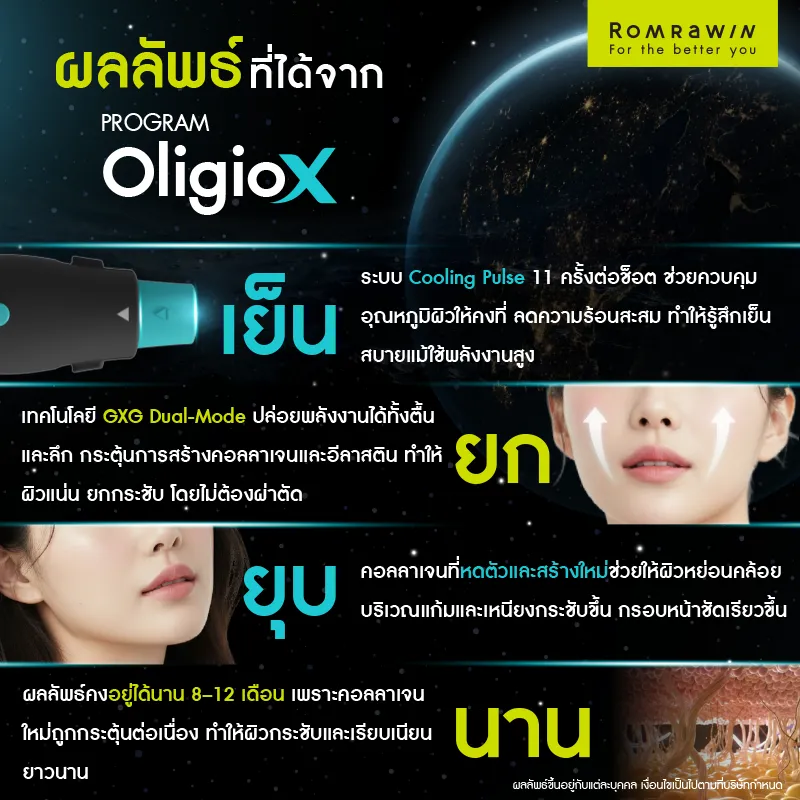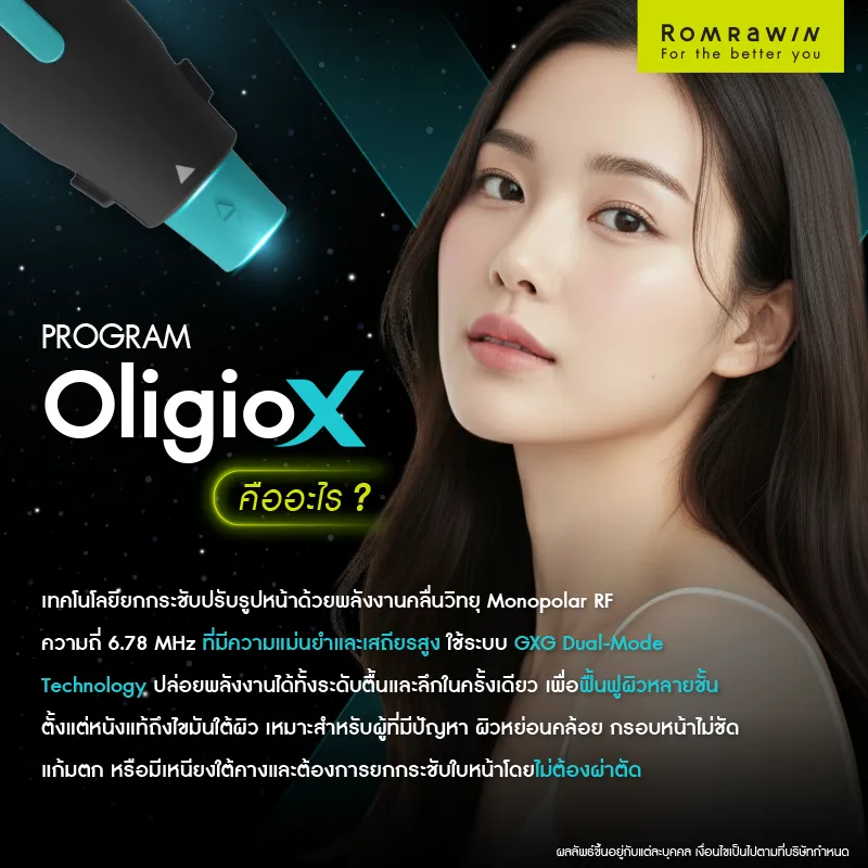 โปรแกรม OligioX ถือเป็นการยกระดับเทคโนโลยี RF รุ่นใหม่ ที่มอบทั้งพลังงานที่ลึกและแม่นยำยิ่งขึ้น ควบคู่กับความสบายระหว่างทำ จึงตอบโจทย์ผู้ที่ต้องการยกกระชับกรอบหน้า ฟื้นฟูความยืดหยุ่นของผิว และยกกระชับกรอบหน้าให้ดูเรียวกระชับขึ้นโดยไม่ต้องพักฟื้นนาน