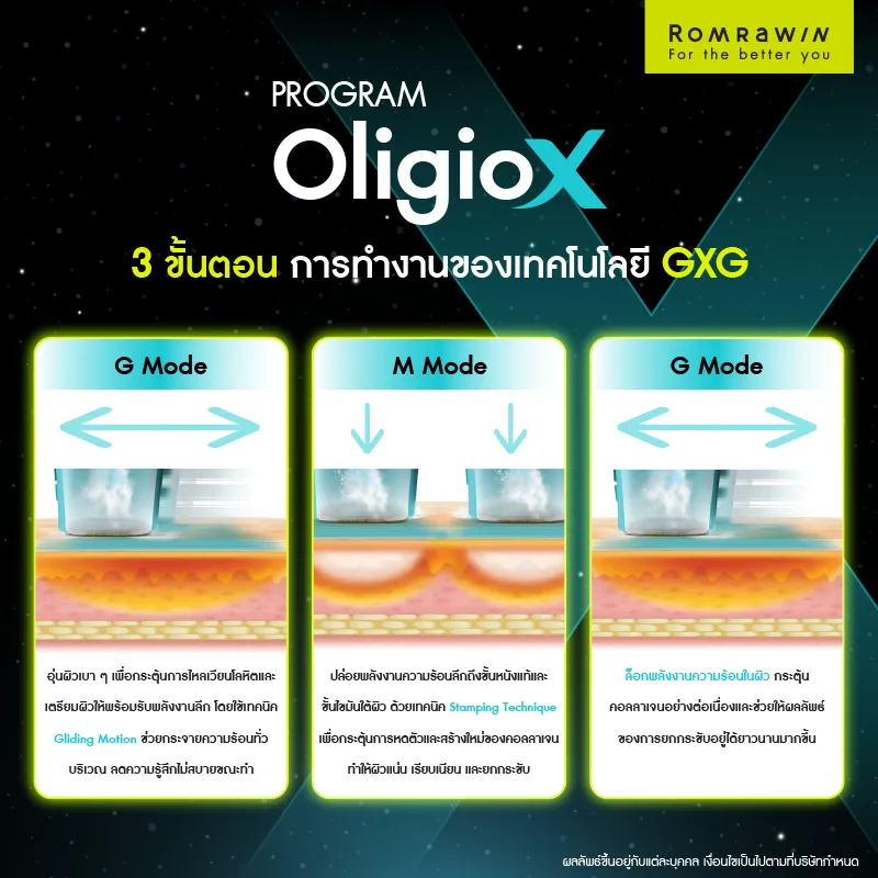หัวใจสำคัญของโปรแกรม OligioX คือเทคโนโลยีเฉพาะที่เรียกว่า GXG Dual-Mode System ซึ่งจะปล่อยพลังงานผ่านลำดับขั้นตอน 3 ช่วง เพื่อกระตุ้นการฟื้นฟูผิวได้อย่างมีประสิทธิภาพ