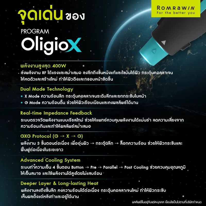 โปรแกรม OligioX เป็นเทคโนโลยีที่ใช้หลักการปล่อยพลังงานคลื่นวิทยุแบบขั้วเดียว Monopolar RF ลงสู่ผิว เพื่อสร้างความร้อนในชั้นลึกได้อย่างแม่นยำ โดยออกแบบให้ทำงานผ่านระบบ Dual Mode Technology ที่ผสานการทำงานระหว่างหมดตื้นและโหมดลึกอย่างเป็นจังหวะ เพื่อให้ได้ผลลัพธ์ของการยกกระชับกรอบหน้าที่ครอบคลุมทุกระดับชั้นผิว