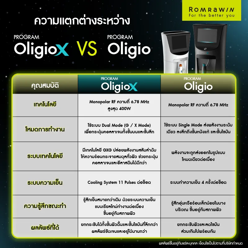 แม้ว่าโปรแกรม OligioX และโปรแกรม Oligio รุ่นเดิม จะใช้เทคโนโลยีคลื่นวิทยุแบบขั้วเดียว Monopolar RF เช่นเดียวกัน แต่ในโปรแกรม OligioX มีการปรับปรุงระบบภายในให้มีความเสถียรและแม่นยำมากกว่าเดิม เพื่อเพิ่มประสิทธิภาพในการยกกระชับกรอบหน้า และฟื้นฟูผิวให้ระดับลึกได้ดียิ่งขึ้น