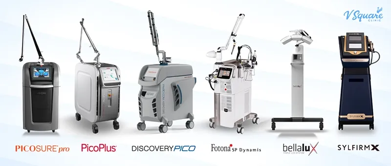 สำหรับที่ V Square Clinic มีเทคโนโลยี Rejuvenation Laser ให้เลือกหลากหลาย ครอบคลุมทุกปัญหาผิว ไม่ว่าจะเป็น PicoSure Pro, Discovery Pico, Pico Plus, Bellalux Lite, Fotona SP Dynamis และ Sylfirm X Plus เพื่อให้เหมาะกับสภาพผิวและเป้าหมายการรักษาของแต่ละบุคคล