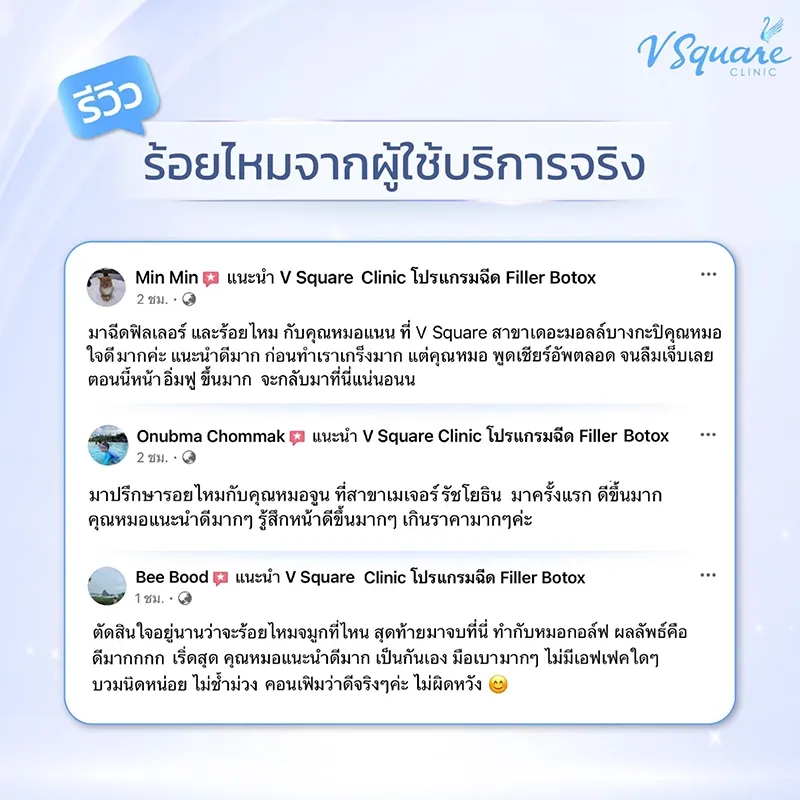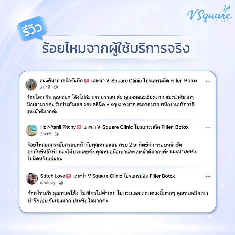 สำหรับที่ V Square Clinic ใช้เส้นไหม ที่มีคุณภาพ ผ่านการรับรองจาก FDA ทั้งในเมืองไทยและต่างประเทศว่ามีความปลอดภัย โดยหลายคนที่เข้ามาทำร้อยไหมกับ V Square ต่างให้รีวิวเชิงบวก และบอกเป็นเสียงเดียวกันว่าคุ้มค่า เห็นผล และรู้สึกมั่นใจมากขึ้น โดยหมอได้รวบรวมรีวิวจากผู้ใช้บริการจริงที่เคยทำร้อยไหมมาแชร์ให้อ่านกันแล้วครับ