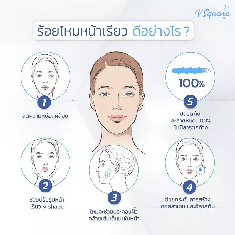 - ร้อยไหมหน้าเรียว : ช่วยปรับรูปหน้าให้ได้สัดส่วน เรียวแบบ V-Shape ยกกระชับแก้มที่หย่อนคล้อย