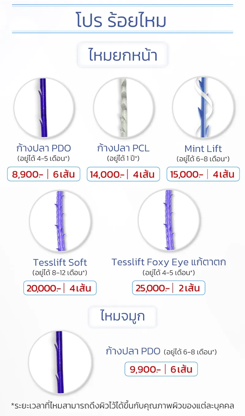 หมายเหตุ : ราคาร้อยไหมอาจมีการเปลี่ยนแปลงตามโปรโมชันส่งเสริมการตลาด แนะนำให้ปรึกษาแพทย์ และอัปเดตราคาล่าสุดกับทางคลินิก