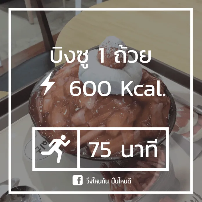 ถ้าพูดถึงของหวานสุดฮิตที่ปัจจุบันเป็นที่นิยมกันอย่างแผ่หลาย ผมเชื่อว่าคนส่วนใหญ่ก็คงนึกถึง “บิงซู” กันเป็นอย่างแรก ของดีจากเกาหลี ที่เป็นของโปรดแฟนใครหลายๆคนนั้น เห็นอย่างนี้แคลอรี่พุ่งกระฉูดถึง 600 กิโลแคลอรี่เลยนะ!! เพราะนอกจากเกร็ดน้ำแข็งละมุนลิ้นที่เราทานกันเข้าไปแล้ว มันยังมีทั้ง นม ครีม ผลไม้ และไอศครีม(บางเมนู) ผสมอยู่ในนั้นด้วยจนหลายคนอาจจะลืมคิดไปว่าเราไม่ได้กินแค่เกร็ดน้ำแข็งนะเฮ่ย! เพราะฉะนั้นถ้าคุณกล้ากินเราก็ขอท้าให้คุณกล้าวิ่ง สัก 75นาทีเบาๆ เท่านี้ก็ใช้กรรมหมดแล้ว ชิลๆ