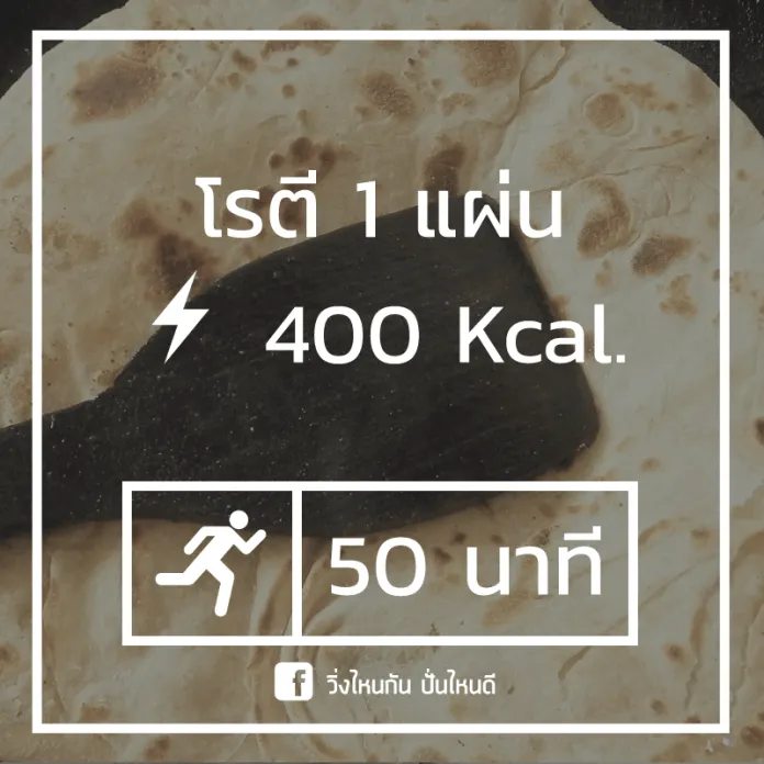 “โรตีแผ่นใหญ่ๆใส่ทั้งไข่ใส่ทั้งนม” ใส่เยอะขนาดนี้ลองเดาเล่นๆซิว่าแคลอรี่ทั้งหมดที่มีจะเป็นเท่าไหร่?? แท่ม แทมมมมม!! ผลลัพธ์ออกมาแล้วจ้าา โรตี 1 แผ่นธรรมดาให้พลังงานมากถึง 400 กิโลแคลอรี่ ซึ่งถ้าใครชอบเพิ่มนมข้น เพิ่มน้ำตาล เพิ่มทอปปิ้ง ก็ลองเดาเอาเองแล้วกันนะครับว่าพลังงานที่ได้จะยิ่งเพิ่มทวีคูณไปอีกเท่าไหร่ และหากคุณคิดจะไปวิ่งเพื่อใช้กรรมจากอบังแล้วล่ะก็ หึหึ คุณต้องใช้เวลา 50 นาที จึงจะเบิร์นหมด