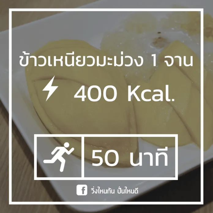 สำหรับเมนูนี้เจ้า “ข้าวเหนียวมะม่วง” จัดว่าเป็นไฮไลท์ของใครหลายคน ที่มักจะตั้งตารอคอยปิดท้ายเมนูนี้หลังมืออาหาร ในขณะที่คุณกำลังปิดคอร์สอาหารอย่างได้อรรถรส รู้หรือไม่ว่ามันมีพลังงานแฝงลึกลับซ่อนอยู่ถึง 400 แคลอรี่เลยทีเดียว!! กินเสร็จแล้วอย่าลืมไปใช้กรรมสัก 50 นาทีนะ ถ้าไม่ยอมวิ่งล่ะก็ “ระวังมันจะมาโดยไม่รู้ตัว(พุง)”