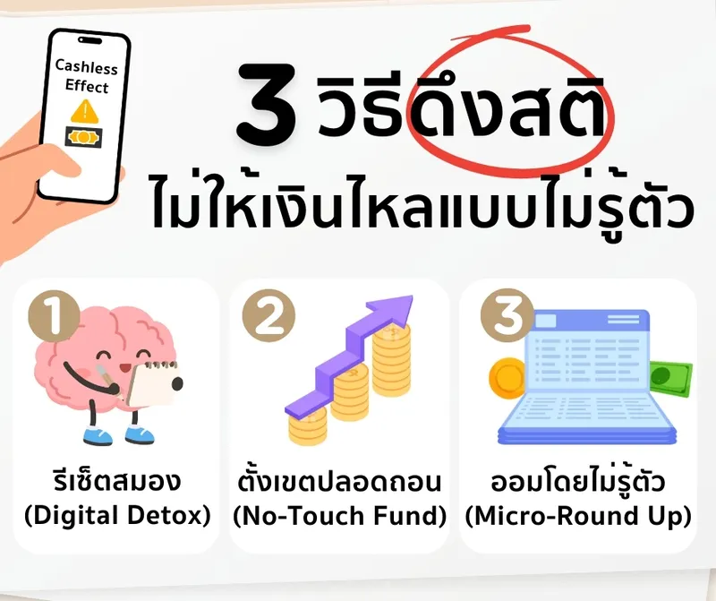 กำหนดวัน Digital Detox อย่างน้อย 1 วันต่อสัปดาห์สำหรับบังคับตัวเองให้ใช้เฉพาะเงินสด และจดบันทึกทุกการใช้จ่าย เพื่อให้สมองส่วนที่ควบคุมการตัดสินใจ อารมณ์และพฤติกรรม (Anterior Cingulate Cortex) กลับมาจดจำความรู้สึกตอนหยิบเงินออกจากมืออีกครั้ง จะช่วยทำให้ความรู้สึกเสียดายหรือยับยั้งชั่งใจที่เคยหายไปกลับมา และช่วยให้เราตัดสินใจรอบคอบขึ้นในวันที่ต้องใช้เงินดิจิทัล