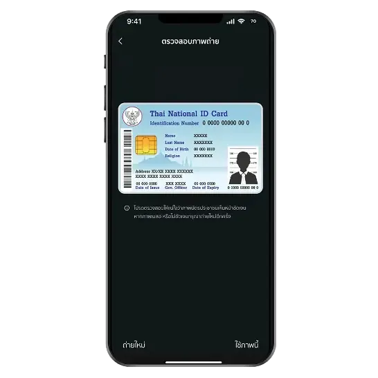 2. ถ่ายภาพและยืนยันข้อมูลบัตรประชาชน ตรวจสอบข้อมูล กรอกรหัสหลังบัตรประชาชนและอีเมล จากนั้นตั้ง PIN 6 ตัวและกรอกข้อมูลส่วนตัว