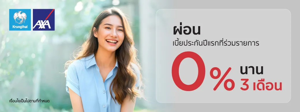 • ขอสงวนสิทธิ์การผ่อนชำระค่าเบี้ย 0% นาน 3 เดือน สำหรับค่าเบี้ยประกันชีวิตและประกันสุขภาพปีแรกผ่านช่องทางที่กำหนดเท่านั้น