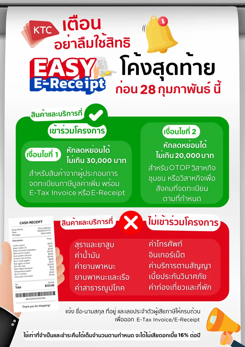 โครงการอีซี่ อี – รีซีท (Easy E-Receipt) ได้เริ่มมาตั้งแต่วันที่ 16 มกราคม 2568 ขณะนี้เหลือเวลาอีกเพียงไม่กี่วันที่ทุกคนจะได้ใช้สิทธิลดหย่อนภาษีก่อนสิ้นสุดมาตรการในวันที่ 28 กุมภาพันธ์ 2568 เคทีซี หรือ บริษัท บัตรกรุงไทย จำกัด (มหาชน) ชวนสมาชิกมาทบทวนอีกครั้งหากต้องการใช้สิทธิอีซี่ อี – รีซีท (Easy E-Receipt)