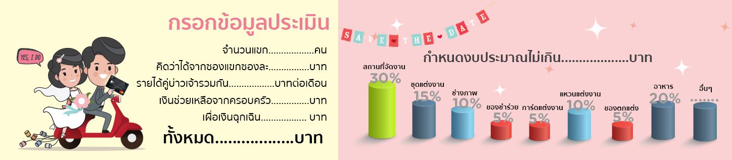 เรื่องของเงินเป็นเรื่องสำคัญมาก ต้องจัดการวางแผนให้ดี และเพื่อวางแผนแบ่งค่าใช้จ่ายแต่ละประเภทในส่วนการจัดงานแต่งงานด้วย