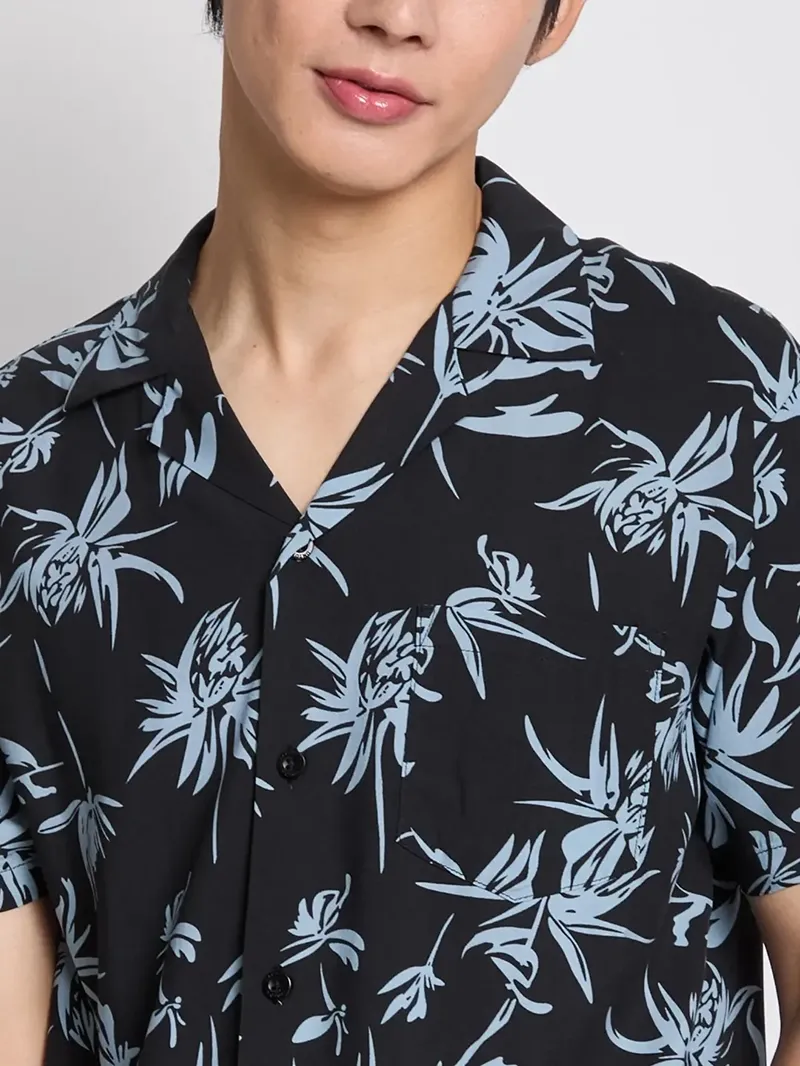 Floral Dark Background เสื้อฮาวายลวดลายดอกไม้หลากสีสันที่อยู่บนเสื้อสีพื้นโทนเข้ม อย่างน้ำเงิน กรมท่า หรือสีดำ ให้ความรู้สึกแบบมีระดับ และน่าค้นหากว่าลายดอกบนเสื้อฮาวายสีพื้นโทนสว่าง