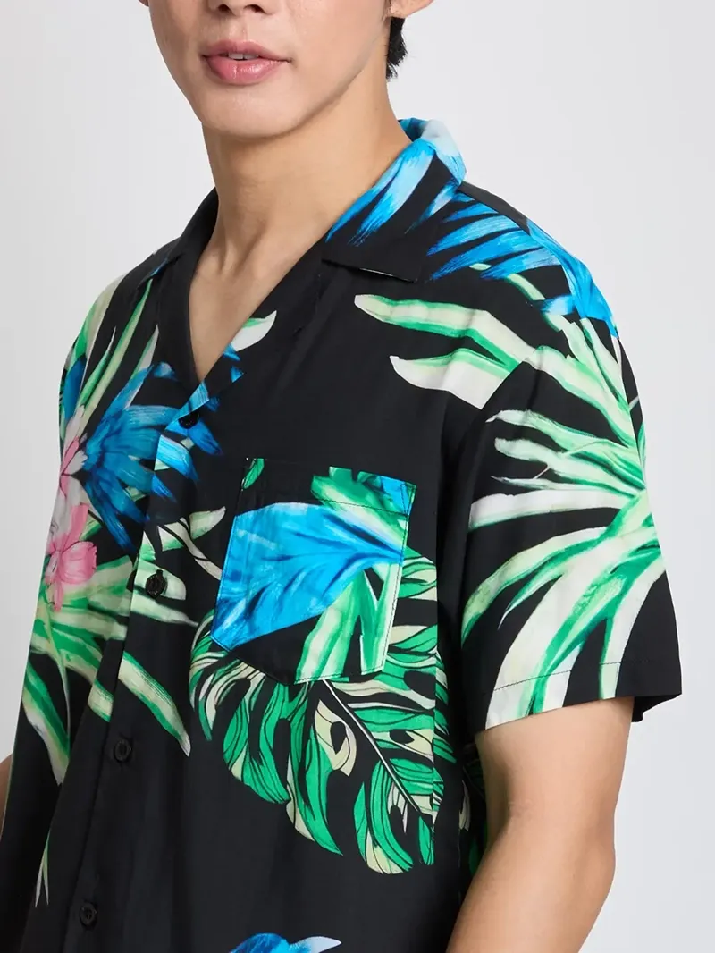 Monochrome Black Aloha เสื้อฮาวายสีดำล้วนหรือมีลายโทนดำ-เทา ให้ความรู้สึกเท่และดูสุขุม เหมาะสำหรับสวมใส่ไปกับงานปาร์ตี้สงกรานต์ในเวลากลางคืน อาทิ เสื้อฮาวายสีดำเข้มจาก PACIFIC UNION ที่มีลวดลายดอกไม้แต่ไม่เน้นสีสันฉูดฉาด และแม้จะไม่ใช้สีเขียวหรือสีของดอกไม้ชนิดนั้น ๆ โดยตรง แต่ก็ยังให้ความรู้สึกของการเป็นเสื้อฮาวายอย่างชัดเจน อีกทั้งยังสวมใส่ง่ายไม่ว่าจะในช่วงเทศกาลสงกรานต์ และในยามออกทริปเที่ยวทะเลก็สามารถหยิบมาใส่ได้บ่อย ไม่มีเบื่อ