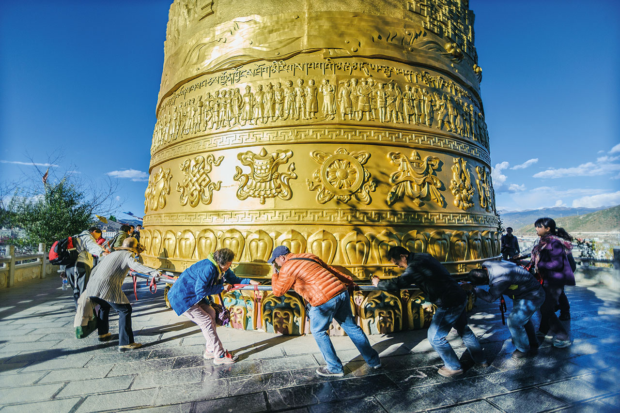 วัดต้าฝอซื่อ วัดศักดิ์สิทธิ์คู่บ้านคู่เมืองแชงกรีล่า ตั้งอยู่บนเนินเขาที่มีกงล้อสีทองขนาดยักษ์ โดยไฮไลท์ของที่นี่คือหากต้องการขอพรจะต้องช่วยกันออกแรงหมุนกงล้อจนกว่าจะขอพรเสร็จ ซึ่งต้องใช้คนมากกว่า 20 คนในการออกแรงหมุนกันเลยทีเดียว อีกทั้งบริเวณนี้ยังเป็นเนินเขาที่สามารถมองเห็นวิวโดยรอบของเมืองจงเตี้ยนหรือแชงกรีล่าได้อย่างสวยงามชัดเจน