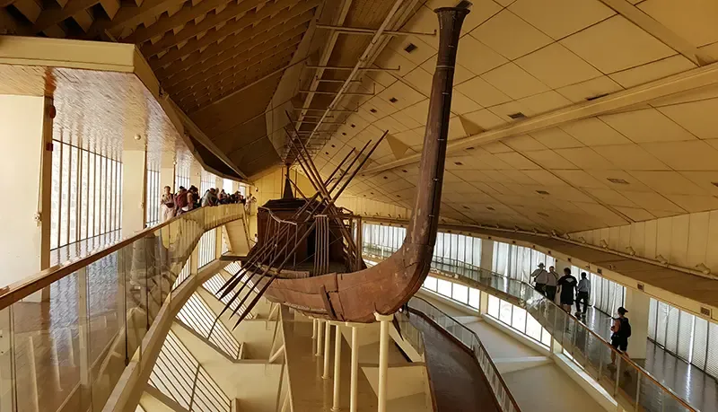 พิพิธภัณฑ์เรือสุริยันข้างมหาพีระมิดกีซา จัดแสดงเรือไม้สุริยันของฟาโรห์คูฟู (Khufu Solar Boat) ที่ฝังไว้เมื่อกว่า 4,500 ปีก่อน ใช้เป็นพาหนะเดินทางกับสุริยเทพ “รา” สู่ชีวิตหลังความตาย ตัวเรือยาวกว่า 40 ม. ทำจากไม้ซีดาร์เลบานอน ประกอบกว่า 1,200 ชิ้นที่ถูกค้นพบและบูรณะใหม่อย่างประณีต การชมเรือเผยให้เห็นวิศวกรรมและงานฝีมืออียิปต์โบราณ พร้อมสะท้อนความศรัทธาลึกซึ้งของชาวอียิปต์เกี่ยวกับเส้นทางสู่ฟากฟ้าและความเป็นอมตะของฟาโรห์