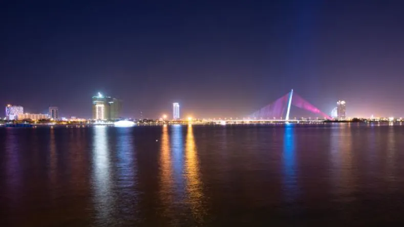 ยามเช้าเวลาแสงทองเริ่มสาดเมืองดานัง สะพานนี้เหมาะที่สุด สำหรับการเดินเล่น ดูเมืองก่อนสาย มีสะพานมังกรทอดยาวเหนือน้ำฮาน เห็นคนเมืองสัญจรไปมา ไกลออกไปมีเมืองขนาบแม่น้ำ ภูเขาประดับเป็นพื้นหลังอยู่ลิบๆ หมอกขาวบางยังคลุมเมืองให้พอรู้ว่าอากาศที่นี่ยังมีความเย็นสบายอยู่
