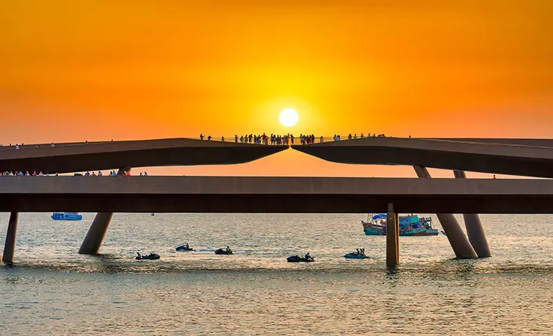 ต่อด้วยการเดินเล่นริมทะเลในย่านยุโรปโทนอุ่นที่สวยราวฉากหนัง โดดเด่นด้วยอาคารพาสเทล โค้งอาร์คเมดิเตอร์เรเนียน และถนนหินที่ให้บรรยากาศละมุนทุกก้าว สายถ่ายรูปจะได้เก็บมุมงามตั้งแต่คาเฟ่ริมทะเลจนถึงลานน้ำพุ ก่อนมุ่งหน้าไปยัง Kiss Bridge สะพานดีไซน์ร่วมสมัยที่โค้งเข้าหากันกลางทะเล สื่อถึงความรักและการเชื่อมโยงอย่างงดงาม โดยเฉพาะยามพระอาทิตย์ตก เมื่อแสงทองสะท้อนผิวน้ำให้ภาพละมุนราวกับงานศิลป์