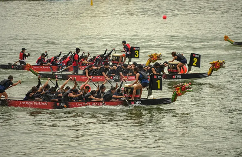 เทศกาลเรือมังกรจัดขึ้นในช่วงเดือนมิถุนายน เพื่อรำลึกถึงประเพณีจีนโบราณ การแข่งขันเรือมังกรที่แม่น้ำกัลลังเป็นกิจกรรมหลัก มีทั้งทีมมืออาชีพและทีมสมัครเล่นเข้าร่วม ท่ามกลางเสียงเชียร์ของผู้ชม พร้อมการแสดงศิลปวัฒนธรรมจีนและการทานจงจือ หรือข้าวเหนียวห่อใบไผ่ เมนูประจำเทศกาลที่หาทานได้ทั่วทั้งเมือง สะท้อนให้เห็นถึงการให้คุณค่าต่อความสำคัญของครอบครัว การรำลึกถึงบรรพบุรุษ และการสืบทอดวัฒนธรรมจีนในสังคมสิงคโปร์ปัจจุบัน