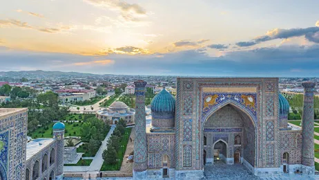 จัตุรัสกลางเมืองซามาร์คันด์ได้รับการกล่าวขานว่ามีความงดงามที่สุดในเอเชียกลาง ตกแต่งด้วยกระเบื้องเคลือบสีฟ้าตัดขอบด้วยสีเหลืองรายล้อมด้วยโรงเรียนสอนศาสนาขนาดใหญ่มหึมาทั้ง 3 ด้าน ยิ่งใหญ่อลังการงดงาม ด้วยศิลปะอิสลามที่ได้รับอิทธิพลจากเปอร์เซีย