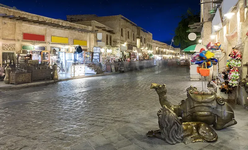 ตลาดละลายทรัพย์ใจกลางกรุงโดฮาที่เปิดมาตั้งแต่ต้นศตวรรษที่ 20 เคยเป็นจุดค้าขายของชาวเบดูอินริมวาดี ก่อนบูรณะครั้งใหญ่ช่วงทศวรรษ 2000 ให้กลับมามีรูปแบบดั้งเดิม อาคารก่อด้วยดินโคลน ไม้ และหิน สะท้อนสถาปัตยกรรมอาหรับพื้นถิ่น ซอกซอยแคบคดเคี้ยวสร้างบรรยากาศแบบตลาดโบราณ ภายในแบ่งเป็นโซนจำหน่ายสินค้า ตั้งแต่เครื่องเทศ สมุนไพร น้ำหอม ผ้าพื้นเมือง งานหัตถศิลป์ ไปจนถึงของที่ระลึก โดยโซนที่มีชื่อเสียงที่สุดคือ Falcon Souq ตลาดเหยี่ยวซึ่งสะท้อนวัฒนธรรมการล่าสัตว์ของชาวกาตาร์ และยังมีโรงพยาบาลเหยี่ยวอยู่ในพื้นที่เดียวกัน ตลอดแนวตลาดเรียงรายด้วยร้านอาหารและคาเฟ่ ทั้งอาหารกาตารีและตะวันออกกลางแบบดั้งเดิม ช่วงเย็นเป็นเวลาที่คึกคักที่สุด แสงไฟโทนอุ่นและเสียงดนตรีสดช่วยเติมชีวิตชีวาให้ตลาดเก่าแห่งนี้ทุกค่ำคืน