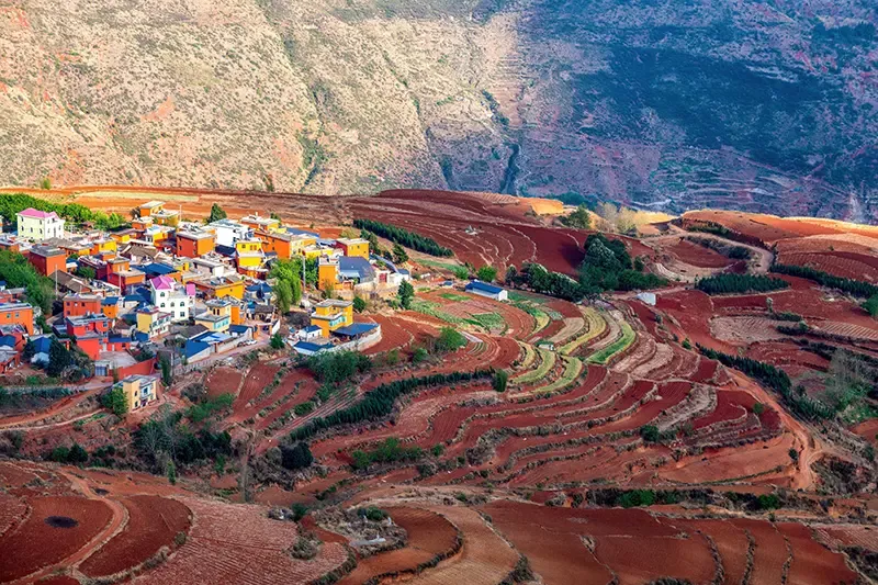 อีกหนึ่งจุดหมายยอดนิยมในช่วงฤดูใบไม้ร่วงที่ถึงแม้จะไม่ได้โดดเด่นในด้านแนวต้นไม้หลากสี แต่ภูมิทัศอันโดดเด่นของตงชวนกลับมีเสน่ห์เฉพาะตัวชวนให้หลงใหลในฐานะ “ภูเขาเจ็ดสีแห่งตงชวน” ด้วยผืนดินที่อุดมด้วยแร่ธาตุเหล็ก ทำให้ดินของที่นี่กลายเป็นสีแดงเข้มสะดุดตา กระจายตัวเป็นเนินเขาและหุบเขาเล็ก ๆ ประกอบกับไร่นาขั้นบันไดและทุ่งเกษตรกรรมที่ชาวบ้านปลูกพืชหลากชนิด ยิ่งในช่วงฤดูใบไม้ร่วงผืนหญ้าและต้นไม้ทั่วบริเวณก็จะมีการเปลี่ยนสีหลากหลายเฉดกระจัดกระจายทั่วบริเวณ เกิดเป็นจานสีขนาดใหญ่ที่รวบรวมสีสันจากพื้นที่ดินแดง ผืนหญ้าสีเขียว สีส้ม และอาคารบ้านเรือนหลากสี ผสมเข้ากันอย่างสวยงามแปลกตาจนดึงดูดช่างภาพจากทั่วโลก นอกจากทิวทัศน์ธรรมชาติ ตงชวนยังเปิดโอกาสให้เข้ามาเรียนรู้วิถีแบบชาวจีนยูนนานแท้ ๆ ชิมอาหารพื้นบ้าน และพักผ่อนสบาย ๆ ในโฮมสเตย์สุดน่ารัก มอบความรู้สึกสงบ ผ่อนคลาย และได้ใกล้ชิดกับธรรมชาติเพียงแค่เอื้อม
