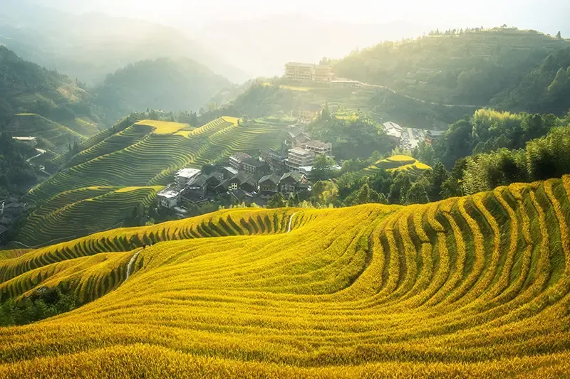 หรือที่รู้จักกันในชื่อ “Dragon’s Backbone” ตั้งอยู่ในมณฑลกวางสี เป็นหนึ่งในนาข้าวขั้นบันไดที่งดงามที่สุดของจีน โดยเฉพาะในฤดูใบไม้ร่วงเมื่อรวงข้าวเริ่มสุกสีทองอร่าม พร้อมต้นไม้รอบข้างที่กำลังผลัดเปลี่ยนใบเป็นสีแดง สีเหลือง และสีส้ม โอบล้อมเป็นภาพถ่ายพาโนรามาสุดตระการตา สะท้อนวิถีชีวิตชนบทดั้งเดิมของชาวจีนกวางสีอยู่ร่วมกับธรรมชาติได้อย่างกลมกลืน สามารถมาเดินชมเส้นทางเลียบขั้นบันได ทอดน่องผ่านหมู่บ้านโบราณ และถ่ายรูปสุดชิคลงในไอจีได้แบบเก๋ไก๋จนต้องกดฟอล ช่วงไพร์มไทม์ที่ต้นข้าวในขั้นบันไดทั่ว Longji Rice Terraces จะเปลี่ยนเฉดเป็นสีทองผ่องอร่ามสะท้อนกับแสงแดดไปทั่วบริเวณคือ ช่วงปลายเดือนกันยายนไปจนถึงปลายเดือนตุลาคม