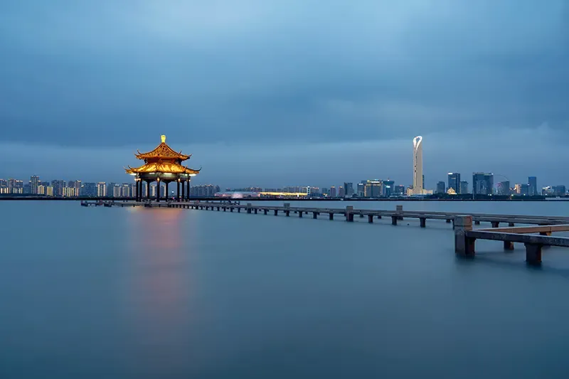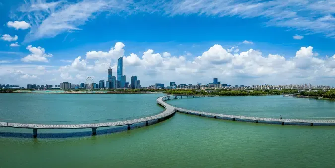 ทะเลสาบจินจี แหล่งธรรมชาติระดับ 5A ใจกลาง Suzhou Industrial Park เป็นภาพแทนของการเติบโตของซูโจวยุคใหม่ที่อยู่เคียงธรรมชาติ เหมาะกับการพักผ่อนและกิจกรรมกลางแจ้ง มีไฮไลท์คือวิวเส้นขอบฟ้าและอาคารสมัยใหม่ที่สะท้อนผิวน้ำอย่างงดงาม ในช่วงพลบค่ำมีการแสดงน้ำพุ แสง สี และดนตรี เพิ่มบรรยากาศคึกคัก พื้นที่โดยรอบรายล้อมด้วยห้าง ร้านอาหาร และคาเฟ่ นักท่องเที่ยวสามารถล่องเรือชมวิวหรือเก็บภาพพระอาทิตย์ตก เผยอีกด้านของซูโจวที่ทันสมัยและมีพลังเมืองชัดเจน กิจกรรมยอดนิยมที่ Jinji Lake คือการเดินเล่นหรือปั่นจักรยานเลียบทะเลสาบ ล่องเรือชมวิวอาคารร่วมสมัย ชมการแสดงน้ำพุยามค่ำ และแวะร้านอาหารหรือคาเฟ่ริมทะเลสาบเพื่อดื่มด่ำบรรยากาศเมืองยุคใหม่ของซูโจวแบบผ่อนคลาย