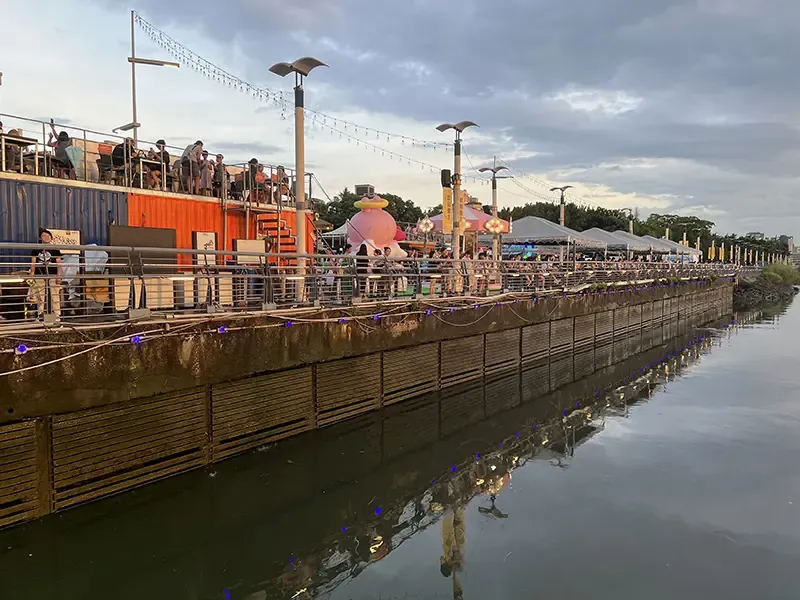 อดีตท่าเรือเก่าแก่ที่เคยเป็นศูนย์กลางการค้าของไทเปได้เปลี่ยนโฉมกลายเป็นตลาดคอนเทนเนอร์สไตล์โมเดิร์นที่เต็มไปด้วยชีวิตชีวา ภาพของรถฟู้ดทรัคสีสันสดใสเรียงรายริมแม่น้ำ ยามเย็นที่แสงอาทิตย์สีทองสาดส่องกระทบผิวน้ำ สร้างบรรยากาศสุดฟินที่ยากจะลืมเลือน