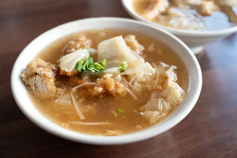 เมนูประจำถิ่นที่ใช้เส้นหมี่ปรุงในน้ำซุปซึ่งใส่เหล้าข้าวหมักพื้นบ้านของหมาจู่ กลิ่นหอมของเหล้าหมักช่วยเพิ่มมิติให้รสซุป โดยมักใส่เนื้อไก่ ไข่ หรืออาหารทะเลลงไปด้วย สูตรดั้งเดิมใช้เหล้า “เหล่าโจ่ว” ซึ่งผลิตในพื้นที่และนิยมใช้ในอาหารท้องถิ่นของเกาะ