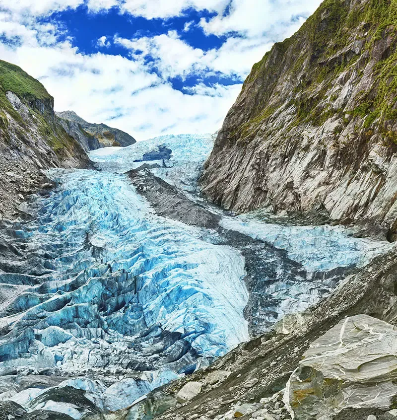 เดินทางสู่ฝั่งตะวันตกของเกาะใต้เพื่อสัมผัสความอลังการของธารน้ำแข็ง Franz Josef ที่ไหลลดหลั่นจากเทือกเขา Southern Alps สู่ผืนป่าฝนเขียวชอุ่มเบื้องล่าง นักท่องเที่ยวสามารถเลือกได้ทั้งการเดินเท้าขึ้นชมปลายธาร หรือบินเฮลิคอปเตอร์ขึ้นไปยังส่วนบนของธารน้ำแข็งเพื่อเดินบนผืนหิมะและน้ำแข็งจริง ๆ ในแสงแดดฤดูร้อนที่สะท้อนประกายระยิบระยับ เป็นประสบการณ์ที่ผสานความงามของขั้วโลกเข้ากับธรรมชาติแบบเขตอบอุ่นได้อย่างลงตัว