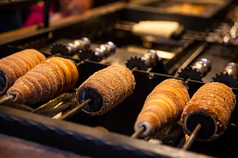 ลองชิม Trdelník ขนมท้องถิ่นชื่อดังของสาธารณรัฐเช็ก ทำจากแป้งโดว์ม้วนเป็นเกลียว นำไปอบจนหอมกรอบ เคลือบน้ำตาลและถั่วอย่างอัลมอนด์หรือวอลนัท ปัจจุบันมีตัวเลือกไส้ยอดนิยม เช่น ไอศกรีม ครีม และช็อกโกแลต