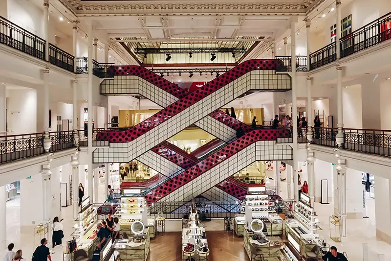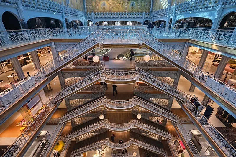 ห้างสรรพสินค้าที่เป็นสัญลักษณ์แห่งการช้อปปิ้งระดับโลกใจกลางกรุงปารีส โดดเด่นด้วยอาคารสไตล์ Haussmann อันวิจิตร และโดมกระจกสไตล์นีโอไบแซนไทน์สูง 43 เมตร ที่ออกแบบโดย Ferdinand Chanut ตั้งแต่ปี 1912 เปรียบเสมือนงานศิลปะที่ส่องแสงธรรมชาติเข้าสู่ภายในห้างอย่างงดงาม ตัวอาคารตกแต่งอย่างประณีตด้วยเหล็กดัดและบันไดวนที่ได้แรงบันดาลใจจากโรงอุปรากรปารีส สร้างบรรยากาศราวกับพิพิธภัณฑ์ศิลปะที่ผสานความคลาสสิกและทันสมัยเข้าด้วยกัน บนพื้นที่กว่า 70,000 ตร.ม. รวบรวมแบรนด์แฟชั่นชั้นนำระดับโลก เครื่องสำอาง และสินค้าไลฟ์สไตล์ให้เลือกสรรอย่างครบครัน ที่นี่จึงเป็นทั้งจุดหมายในฝันของนักช้อปและแหล่งท่องเที่ยวเชิงวัฒนธรรมที่สะท้อนรสนิยมของชาวปารีเซียงได้อย่างชัดเจน ปิดท้ายด้วยการขึ้นไปชมวิวพาโนรามาจากดาดฟ้า ที่เผยให้เห็นความงดงามของมหานครปารีสในมุมที่น่าประทับใจที่สุดแห่งหนึ่งของเมือง