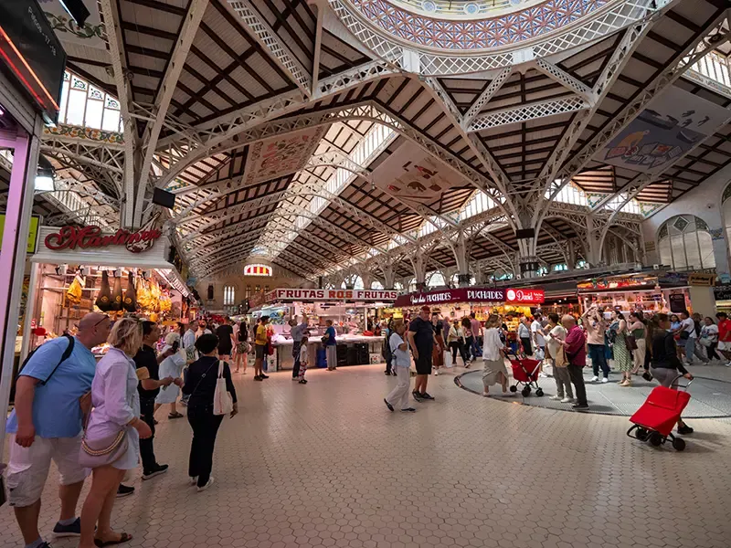 ตลาดเก่าแก่ที่เปิดใช้งานมาตั้งแต่ปี ค.ศ. 1928 และยังเป็นตลาดที่คนท้องถิ่นแวะมาจับจ่ายกันทุกวัน ตัวอาคารสไตล์อาร์ตนูโว มีหลังคาโดมกระจกสีด้านบนที่เปิดรับแสงธรรมชาติให้ส่องลงมาทั่วพื้นที่ ทำให้บรรยากาศโปร่ง เดินแล้วไม่อึดอัด มาที่นี่คือได้กินของดีแบบไม่ต้องคิดเยอะ ไม่ว่าจะเป็น แซนด์วิช Bocadillo หรือข้าวผัด Paella ก็มีครบ ฝั่งผลไม้ก็สดจัดตามฤดู ทั้งส้ม มะเขือเทศ สมุนไพรท้องถิ่น สีสันคือชัดแบบไม่ต้องแต่ง ส่วนโซนซีฟู้ดก็เรียงกันแน่น ๆ ดูแล้วรู้เลยว่าสดจริง ไม่ได้มาเล่น ๆ เดินเพลิน กินเพลิน ได้ฟีลชีวิตคนเมืองแบบเรียล ๆ ไปเลย