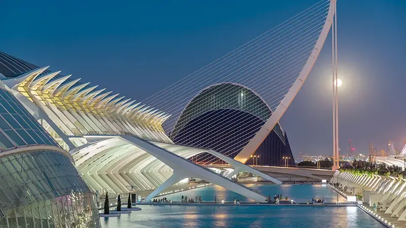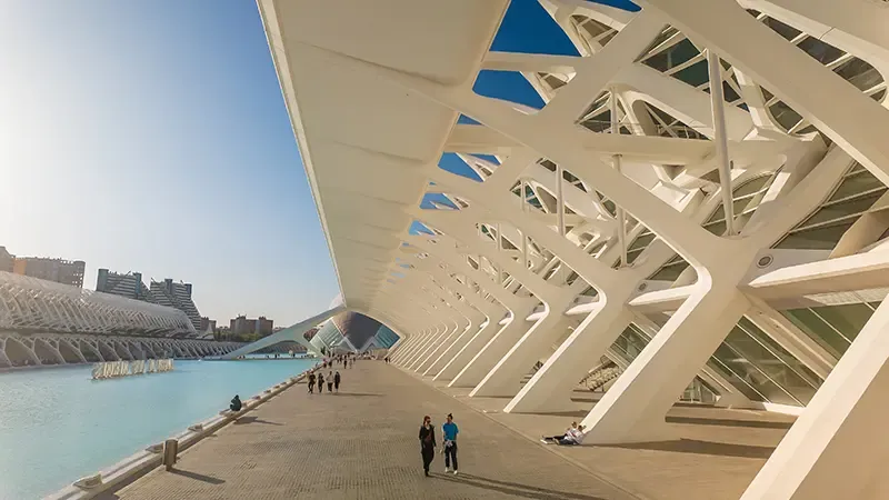 เดินเท้าผ่านเส้นทางเชื่อม Turia ไปเพียง 10 นาที ก้าวเข้าสู่อีกมิติของวาเลนเซียที่มู้ดเปลี่ยนจากเมืองเก่าแบบชัดเจนกับ City of Arts and Sciences คอมเพล็กซ์สายวิทย์และดีไซน์ขนาดใหญ่ที่ออกแบบโดย Santiago Calatrava เส้นสายโค้งยาวของอาคารทำให้ทั้งพื้นที่ดูเหมือนสิ่งมีชีวิตมากกว่าสถาปัตยกรรมทั่วไป ยิ่งมีผิวน้ำล้อมรอบก็ยิ่งสะท้อนให้ทุกอย่างดูคมและล้ำขึ้นไปอีก ภายในมีทั้งพิพิธภัณฑ์วิทยาศาสตร์ โรงภาพยนตร์ Hemisfèric และ Oceanogràfic อควาเรียมขนาดใหญ่ ให้ฟีลเหมือนหลุดมายุคใหม่แบบเต็มตัว