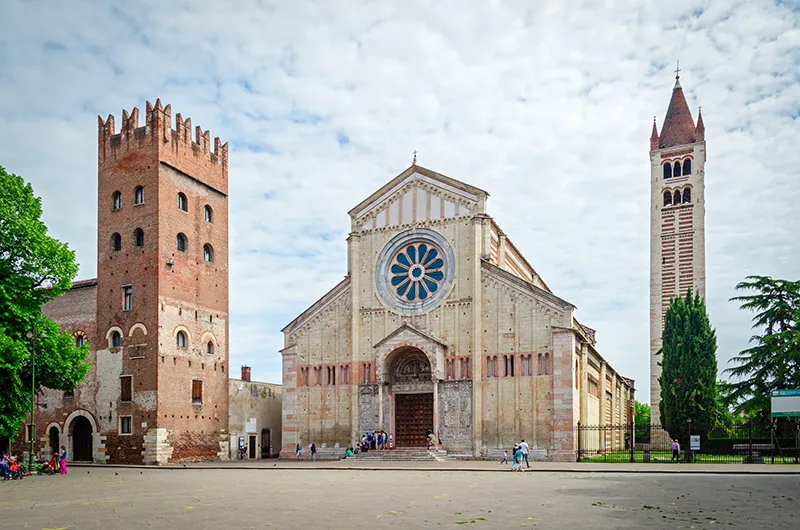 โบสถ์โรมาเนสก์สุดคลาสสิกแห่งนี้ตั้งชื่อตามนักบุญ San Zeno องค์อุปถัมภ์ของเมือง สร้างด้วยหินสีอบอุ่นและหลังคาไม้สูงแบบอิตาเลียน โดดเด่นด้วยหอระฆังสูงชะลูดที่มองเห็นได้จากทั่วเมือง ภายในอลังการไปด้วยความละเมียดละไมของงานศิลป์ โดยเฉพาะประตูสำริดอายุกว่าพันปีที่แกะสลักฉากในพระคัมภีร์อย่างวิจิตรในสไตล์โรมาเนสก์ตอนต้น และภาพเขียนแท่นบูชาโดย Andrea Mantegna หนึ่งในผลงานชิ้นเอกของยุคเรอเนซองส์ตอนต้น ที่ถ่ายทอดเรื่องราวศักดิ์สิทธิ์ด้วยองค์ประกอบแสงเงาและการจัดวางองค์ประกอบที่เปี่ยมอารมณ์ โบสถ์แห่งนี้ไม่เพียงเป็นสถานที่ศักดิ์สิทธิ์ แต่ยังเป็นเครื่องยืนยันถึงความรุ่งเรืองทางศิลปะและศรัทธาของเวโรนาในยุคกลางอย่างลึกซึ้ง